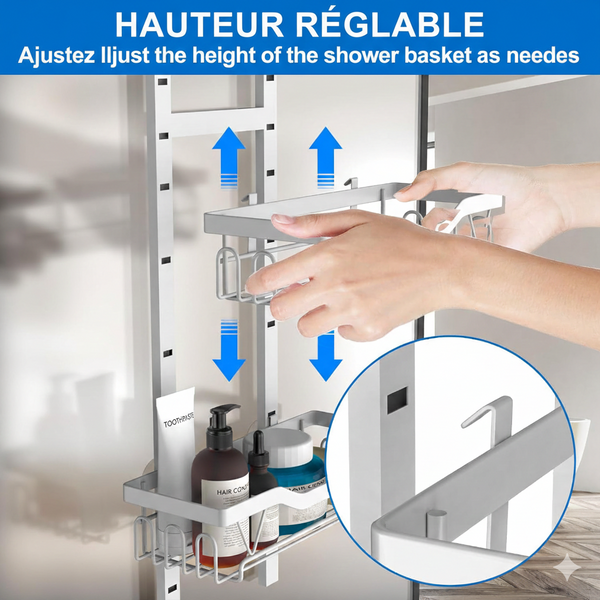 Organisez gel, shampoing et savon à portée de main. La grille ouverte évacue l'eau, garde vos produits secs et évite les flaques glissantes sur le rebord de la douche.