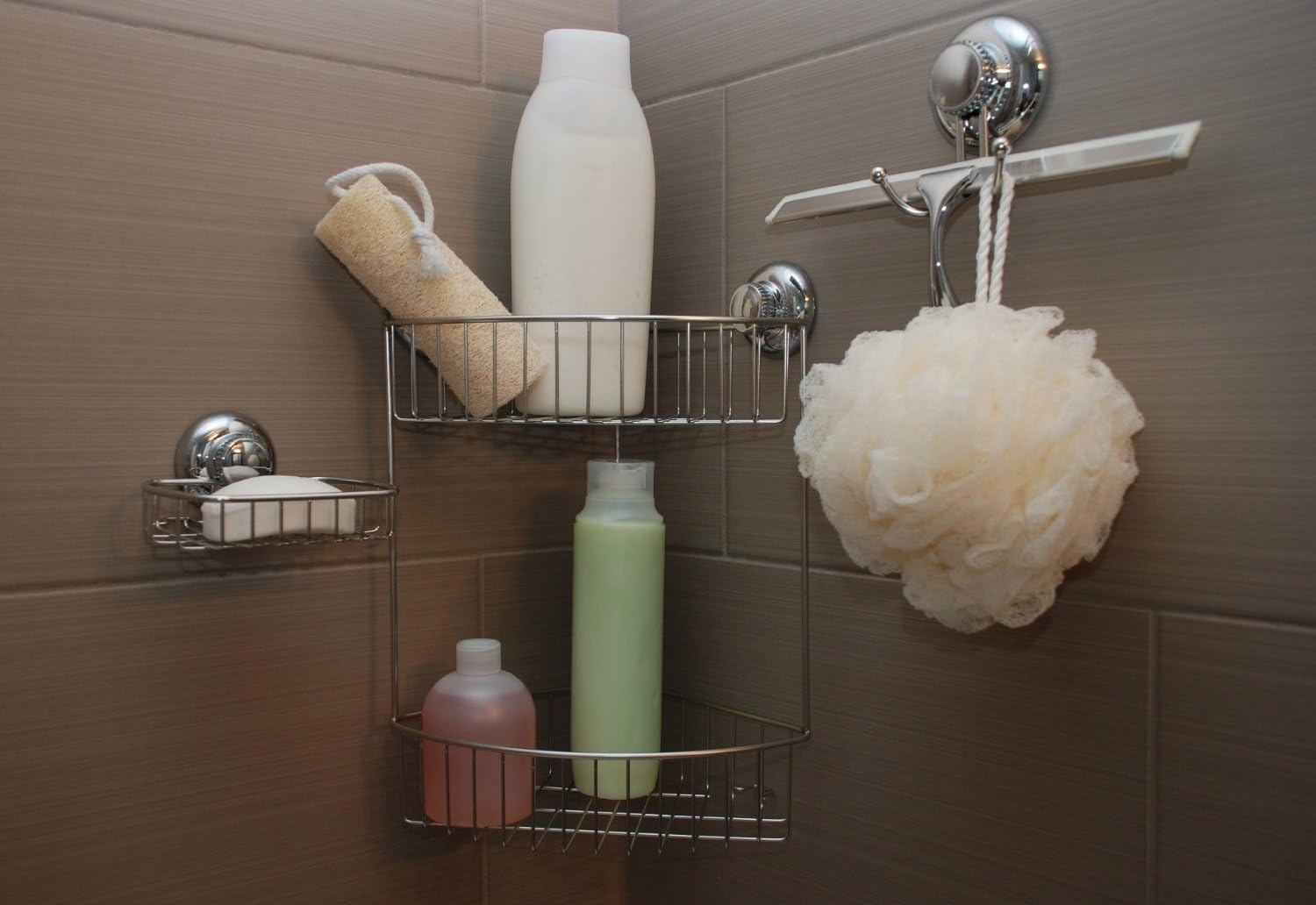 Supporte des charges élevées grâce à la succion brevetée. Rangez porte-savon, rasoirs et éponges sans risque de chute ni d'éclaboussures sur le sol.