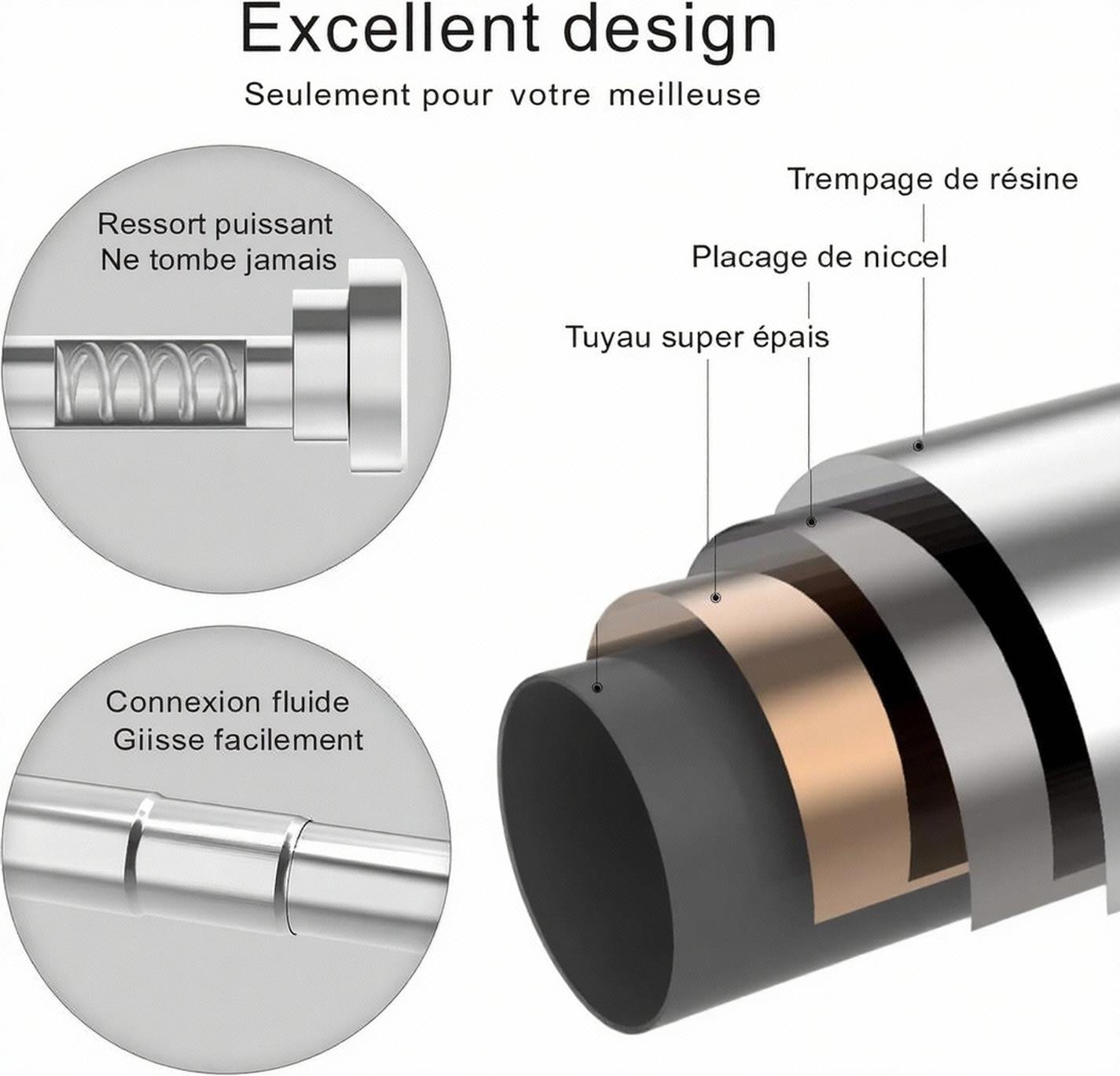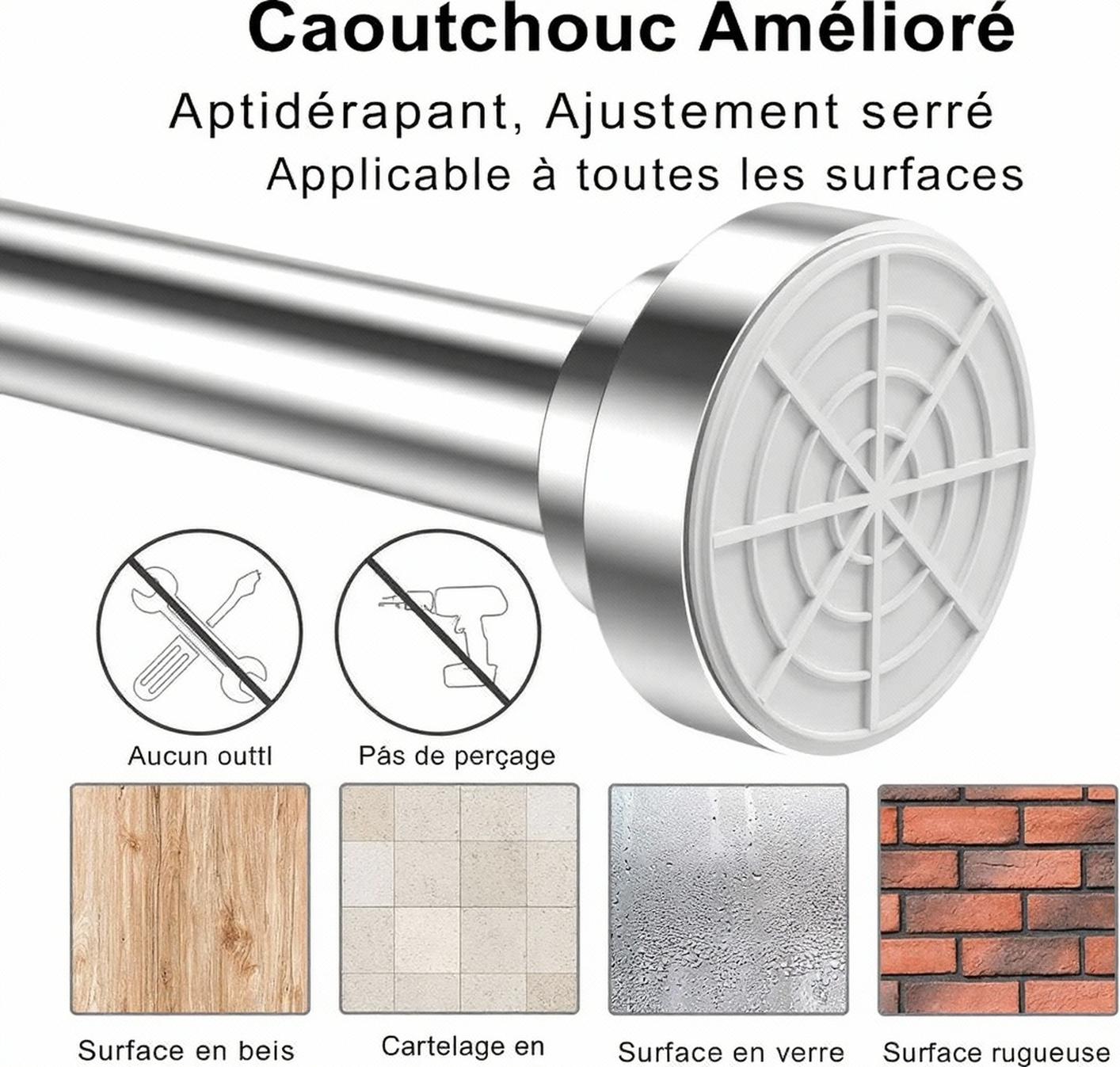 Contrairement aux autres, notre tringle combine fixation sans perçage, acier inoxydable durable, bouton anti-rebond et pieds antidérapants pour une tenue sûre et une installation rapide.